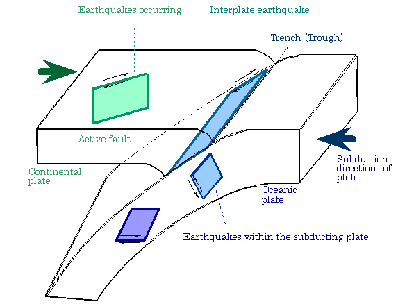 There are various types of earthquakes, such as earthquakes on the plate boundary, earthquakes within subducting (or subducted) plates, and earthquakes occurring on active faults on land.