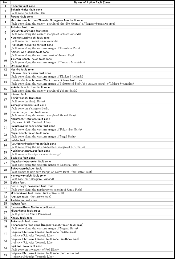 List of the 98 major active fault zones