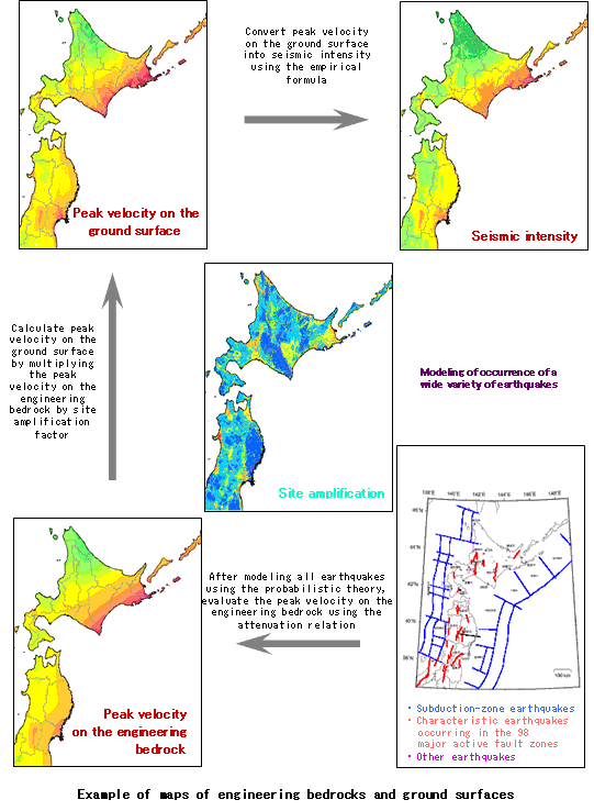 Maps of intensity include the distribution map of the peak velocity on the engineering bedrock, the distribution map of peak velocity on the ground surface and the distribution map of seismic intensity.